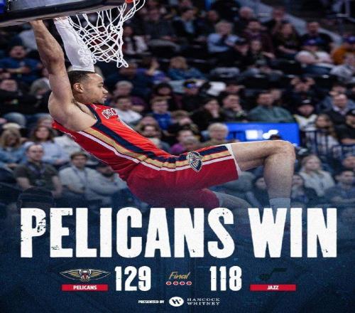 中場休息回來,鵜鶘第三節25-27輸掉2分,第四節26-30再輸4分,最終鵜鶘129-118戰勝爵士收獲3連勝,爵士遭遇4連敗。