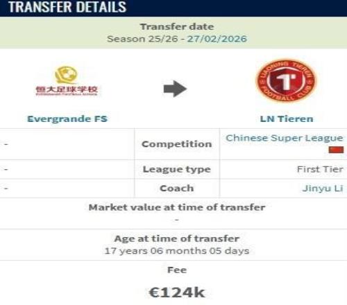 北京時(shí)間2月27日,德轉(zhuǎn)更新,遼寧鐵人約100萬(wàn)人民幣簽下恒大足校17歲后衛(wèi)張洪福。