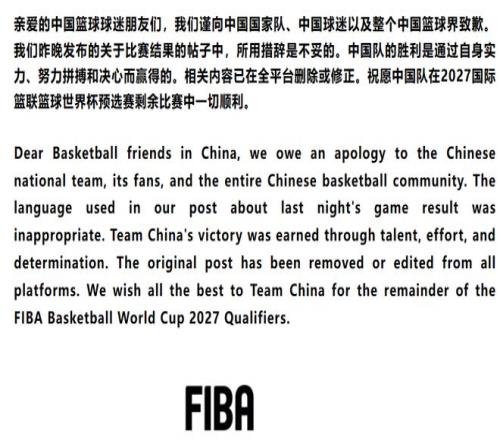 幸好在無數球迷轟炸評論區的情況下,FIBA也在社交網站上進行了道歉,他們明確表示:謹向中國國家隊、中國球迷以及整個中國籃球界致歉。關于比賽結果的帖子中,所用措辭是不妥的。中國隊的勝利是通過自身實力、努力拼搏和決心而贏得的。對于這樣的道歉還算可以接受,因為他們點名了道歉的對象,也點名了錯誤的地方,這是國內球迷可以接受的。只是外網有沒有發不清楚。