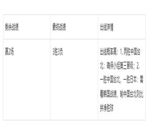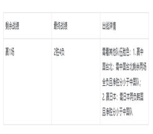 中國隊的1勝若贏在中國臺北男籃身上,日本男籃則會至少3勝晉級,中國隊想要晉級就必須滿足中國臺北男籃剩余兩場全輸(韓國也能3勝晉級),且凈勝分小于中國隊。