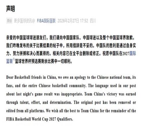 騷操作!用詞不當翻車,FIBA正式致歉中國男籃,評論區直接炸了