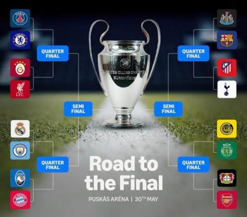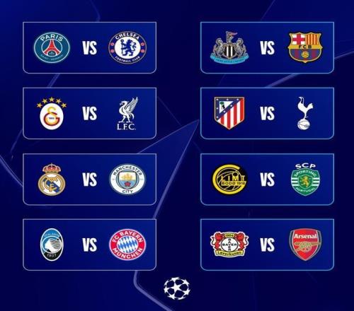 當抽簽完成后,本賽季歐冠1/8決賽對陣敲定:巴黎圣日耳曼VS切爾西、加拉塔薩雷VS利物浦、皇家馬德里VS曼城、亞特蘭大VS拜仁慕尼黑、紐卡斯爾聯VS巴塞羅那、馬德里競技VS托特納姆熱刺、博德閃耀VS葡萄牙體育、勒沃庫森VS阿森納。
