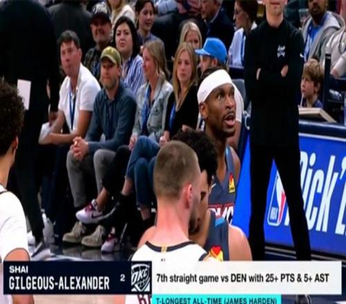 亞歷山大連續7次對陣掘金拿到至少25分5助,追平哈登保持的紀錄。