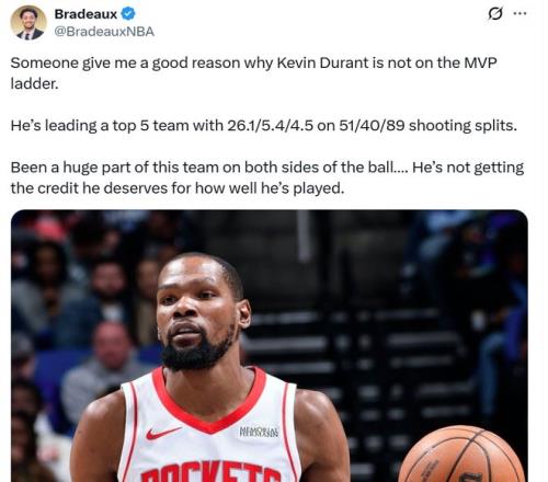 其中率領火箭隊拿下連勝的杜蘭特無緣前十惹火箭媒體不滿,火箭媒體人Bradeaux曬出杜蘭特的數據,場均26.1分5.4板4.5助,三項命中率51/40/89%,帶領火箭殺入前五,卻沒能成為MVP前十候選人,誰能給我一個合理的解釋?Bradeaux配文質疑道。