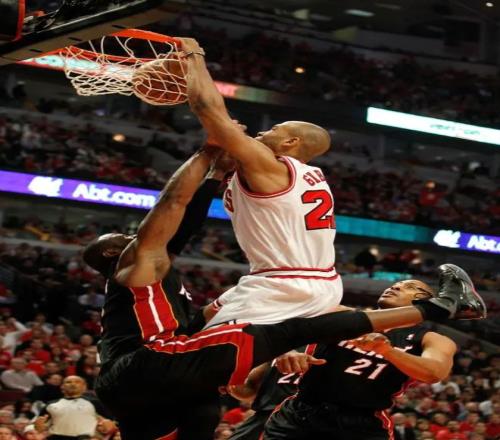 2011年是吉布森相對來說最高光的賽季,他在諾阿和布澤爾都受傷的情況下撐起公牛的內線,并在東決首戰上隔著巔峰韋德來了一記勢大力沉的暴扣。