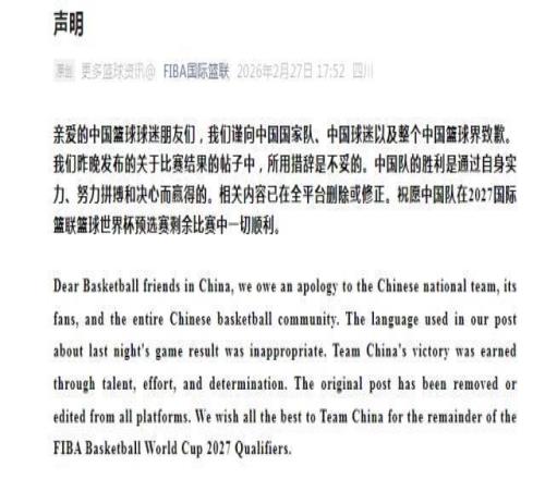 親愛的中國籃球球迷朋友們,我們謹向中國國家隊、中國球迷以及整個中國籃球界致歉。我們昨晚發布的關于比賽結果的帖子中,所用措辭是不妥的。中國隊的勝利是通過自身實力、努力拼搏和決心而贏得的。相關內容已在全平臺刪除或修正。祝愿中國隊在2027國際籃聯籃球世界杯預選賽剩余比賽中一切順利。