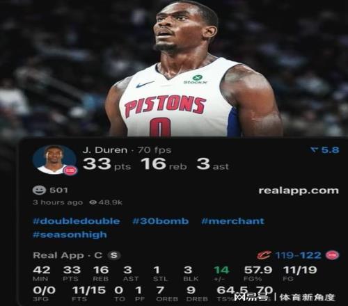 不過話說回來,這場比賽除了騎士的兩大內線表現(xiàn)出色外,活塞的杜倫也是毫不遜色。他全場狂轟33分,還搶下了16個籃板,這豪華的兩雙數(shù)據(jù),簡直讓人看得眼花繚亂。他和阿倫在禁區(qū)內的每一次對位、每一次攻防博弈,都成了比賽中最吸引人的看點,讓人看得熱血沸騰!