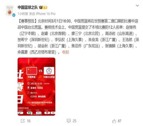 下午17點FIBA公布了中國男籃對陣中國臺北男籃的12人名單,這一份名單和對陣日本男籃的12人大名單一樣,胡明軒和趙嘉義兩名球員仍然被棄用,上一場表現不佳的張鎮麟還在12人大名單中,這也引起了不少球迷的熱議。很多球迷認為張鎮麟不該進入大名單,應該給其他球員機會,但是郭士強指導的教練組堅持帶上張鎮麟或許背后有其他深意吧。