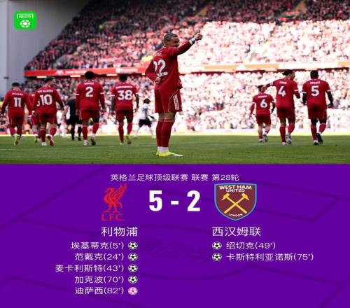 北京時間2月28日,英超聯賽第28輪,利物浦主場迎戰西漢姆聯。上半場,埃基蒂克開場閃擊后又助攻麥卡利斯特破門,索博斯洛伊助攻范戴克頭球建功;下半場,紹切克、卡斯特利亞諾斯為西漢姆聯各扳一城,埃基蒂克助攻加克波擴大領先,替補登場的弗林蓬造成迪薩西自擺烏龍。最終,利物浦5-2大勝西漢姆聯,各項賽事4連勝。