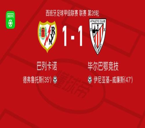 北京時間2月28日西班牙足球甲級聯賽 聯賽 第26輪,巴列卡諾主場對陣畢爾巴鄂競技。巴列卡諾德弗魯托斯破門。畢爾巴鄂競技伊尼亞基-威廉斯破門。最終比分巴列卡諾 1-1 畢爾巴鄂競技。