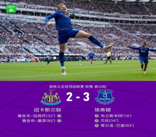 北京時間2月28日英格蘭足球頂級聯賽 聯賽 第28輪,紐卡斯爾聯主場對陣埃弗頓。紐卡斯爾聯雅各布-拉姆齊破門,雅各布-墨菲破門。埃弗頓布蘭斯韋特破門,貝托破門,蒂爾諾-巴里破門。最終比分紐卡斯爾聯 2-3 埃弗頓。