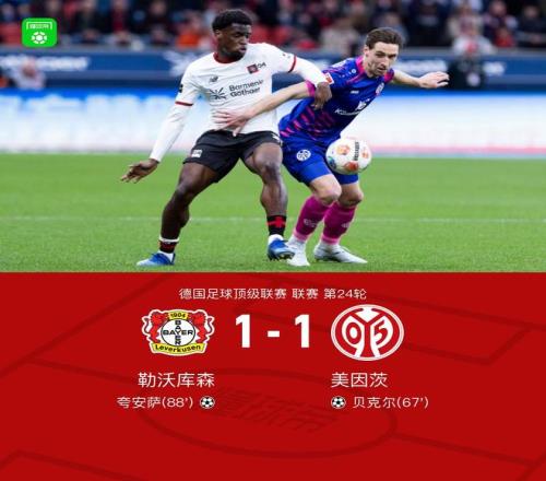 北京時間2月28日德國足球頂級聯賽 聯賽 第24輪,勒沃庫森主場對陣美因茨。勒沃庫森夸安薩破門。美因茨貝克爾破門。最終比分勒沃庫森 1-1 美因茨。