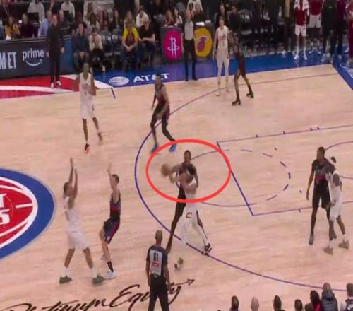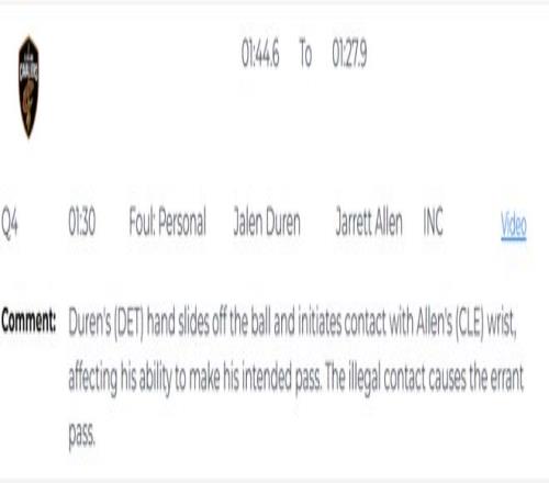 第一次是漏判,發(fā)生在距離第四節(jié)結(jié)束還有1分30秒。杜倫的手從球上滑開(kāi),主動(dòng)接觸到了艾倫的手腕,影響了他完成預(yù)期傳球的能力。這次非法接觸導(dǎo)致了艾倫的傳球失誤。這本該吹杜倫防守犯規(guī),但裁判沒(méi)有響哨,這是一次漏吹的防守犯規(guī),并導(dǎo)致騎士失誤,對(duì)手搶斷得分。活塞獲利,騎士吃虧。
