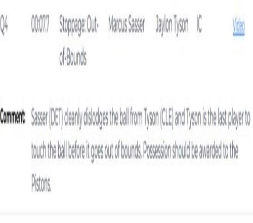 第三次也是錯(cuò)判,發(fā)生在距離第四節(jié)結(jié)束還有7.7秒。活塞的薩瑟干凈地從泰森手中斷球,泰森是球出界前最后觸球的球員。球權(quán)應(yīng)判給活塞隊(duì)。但裁判判給了騎士,這是一次錯(cuò)誤的判罰,活塞吃虧,騎士獲利。