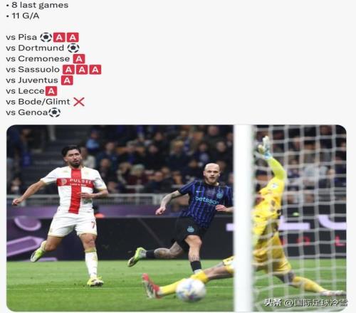 從1月23日對陣比薩,迪馬爾科1球2助攻開始,最近8次迪馬代表國米出場,他總計收獲了3球8助攻。迪馬這波爆發,有兩個關鍵意義,首先,國米在這之前只領先第二名3分,如今則是領先10-13分(具體取決于AC米蘭本輪的成績)。再者,國米過去幾個賽季,1月、2月總會因為賽季中盤綜合癥而丟分,但因為迪馬的關鍵爆發,國米新年之后聯賽除了打平那不勒斯外,全部取勝。